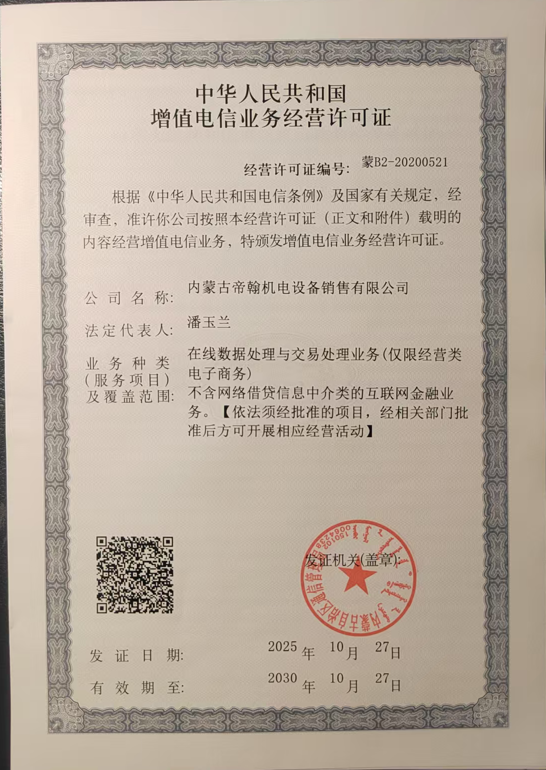 增值电信业务经营许可证蒙B2-20200521
